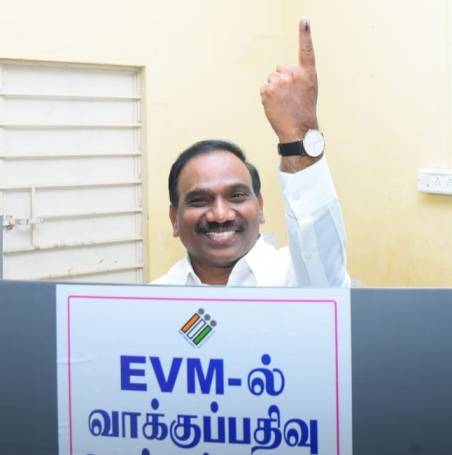 திமுக துணைப் பொதுச்செயலாளரும், நீலகிரி எம்.பியுமாக ஆ.ராசா தனது சொந்த ஊரான பெரம்பலூர் மாவட்டம் வேலூரில் உள்ள அரசு பள்ளியில் வாக்கு செலுத்தினார்.