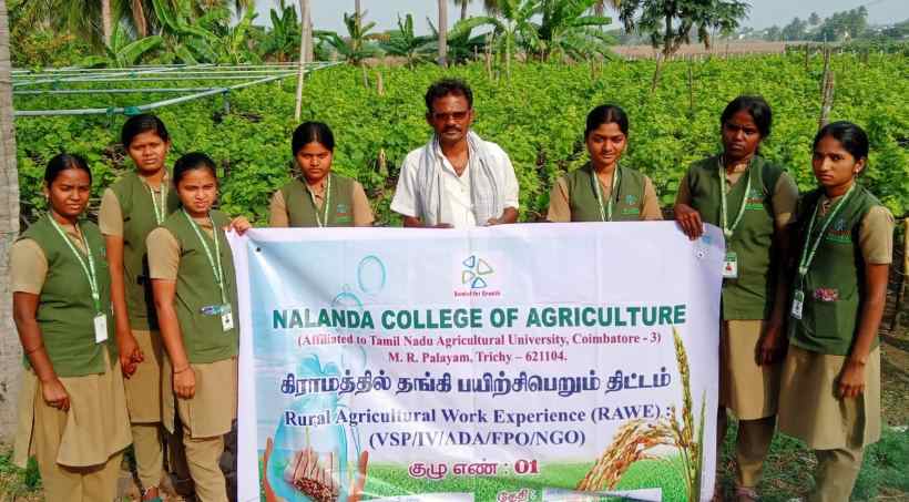 பெரம்பலூர் மாவட்டம், எசனை கிராமத்தில் நாளந்தா வேளாண்மைக் கல்லூரி மாணவியர்கள் கிராமத்தில் தங்கி பயிற்சி பெறும் திட்டத்தின் கீழ், மாணவியர்கள் அ.அபிதாரணி, ரா.அபிநயா, வீ.அன்னலட்சுமி, தோ.அந்தோனியம்மாள், ம. பாமா, ரா. தீபிகா, மு. தேவிகா மற்றும் சே. திவ்யதர்ஷினி திராட்சை சாகுபடி தொடர்பான கள ஆய்வு செய்தனர். இதில் திராட்சை பயிரிடும் முறை, பராமரிப்பு நடைமுறைகள் மற்றும் நவீன தொழில்நுட்பங்கள் குறித்து நேரடி கள அனுபவம் கண்டனர்.