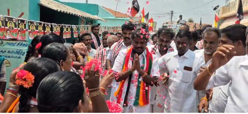 Perambalur AIADMK candidate Elambai R. Tamilselvan receives an enthusiastic welcome, greeted with Aarti performed using a tray of vegetables!