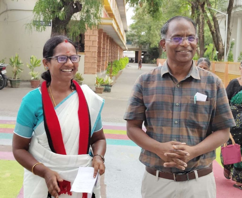 பெரம்பலூர் சட்டமன்ற தொகுதியின் திமுக வேட்பாளர் ஜெயலட்சுமி இன்று காலை பெரம்பலூர் ரோவர் பள்ளியில் தனது வாக்கை கணவர் டாக்டர் கருணாகரன் உடன் செலுத்தினார்.