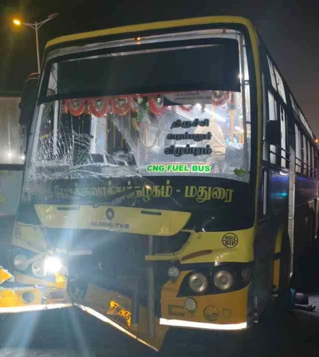 Perambalur: Government bus collides with a car; two people killed after being trapped under the bus wheels when the car door opened!