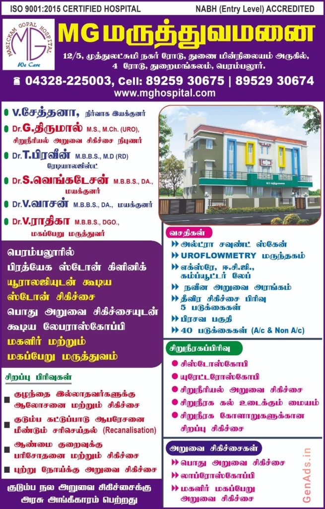 எங்கள் எம்.ஜி மருத்துவமனை மறைந்த எனது தந்தையாரும், ஓய்வு பெற்ற தலைமையசிரியருமான திரு எம். கோபால் அவர்களின் எண்ணத்திலும், நலமுடன் இருக்கும் எனது தாய் மாணிக்கம் அவர்களின் தூண்டுதலின் பேரிலும் உருவானது. மருத்துவமனை சிறுநீரியல் அறுவை சிகிச்சைகள், பொது அறுவை சிகிச்சைகள், பொது மருத்துவம், மகளிர் மகப்பேறு மருத்துவம் ஆகிய துறைகளை உள்ளடக்கி சிகிச்சைகள் இயங்கி வருகிறது. எம்.ஜி மருத்துவமனை தொடங்கி 12 ஆண்டுகள் கடந்தும் நாங்கள் நற்பெயருடன் நல்ல சேவை செய்து கொண்டு வருகிறோம் என்று நம்புகிறோம். மக்களும் அவ்வண்ணமே நம்புகின்றனர் என்று நினைக்கிறேன்.