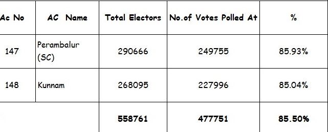 பெரம்பலூர் மற்றும் குன்னம் சட்ட மன்ற தொகுதிகளுக்கான தேர்தல் இன்று காலை 7 மணி முதல் இன்று மாலை 6 வரை வாக்குகள் 85.5 சதவீதம் பதிவாகின. தொகுதிவாரியான விவரம்: பெரம்பலூர் தொகுதி 85.93 சதவீதம், குன்னம் தொகுதி 85.04 சதவீதம். பெரம்பலூர் மாவட்டத்தின் சராவரி பதிவு 85.50 சதவீத வாக்குகள் பதிவாகி உள்ளன.