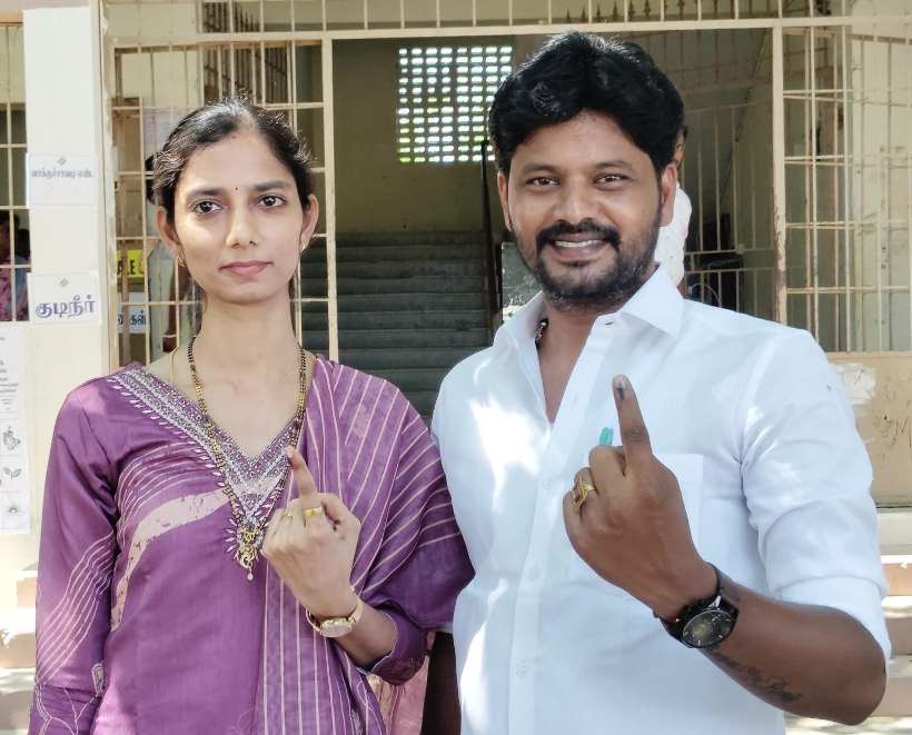 Perambalur: T.R. Sivasankar, a member of the Trichy International Airport Advisory Committee, cast his vote in his hometown alongside his wife, Dr. Alagurani.