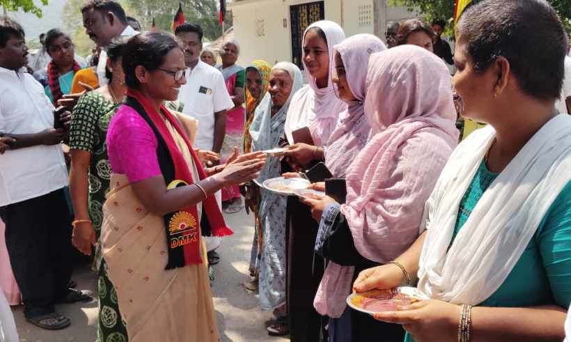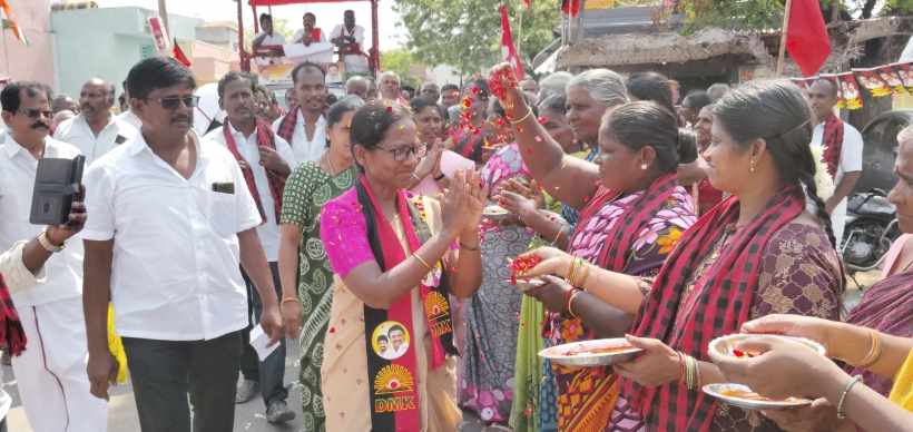 Perambalur: “Vote for the ‘Rising Sun’ symbol to usher in the ‘Dravidian Model 2.0’ era of governance!” — DMK Candidate Jayalakshmi campaigns for votes.