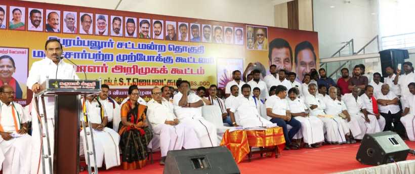 பெரம்பலூர் தனித் தொகுதி திமுக வேட்பாளர் ஜெயலட்சுமி அறிமுகக் கூட்டம், மாவட்ட திமுக பொறுப்பாளர் ஜெகதீசன் தலைமையில் தனியார் திருமண மண்டபத்தில் நடந்தது.
