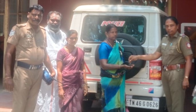 இந்நிலையில், பெரம்பலூர் மாவட்டம் வேப்பந்தட்டை அருகே உள்ள தொண்டப்பாடியை சேர்ந்த மகேஸ்வரி என்பவர் தனது நகையை காணவில்லை என புதிய பேருந்து நிலையம் பகுதியில் அழுது புலம்பி உள்ளார். அந்த நகை இந்த பகுதிகளில் கிடந்ததாகவும், அதை போலீஸ் ஸ்டேசனில் ஒப்படைத்துள்ளதாகவும் தெரிவித்தனர். போலீஸ் நிலையம் சென்ற அந்தப் பெண் எஸ்.எஸ்.ஐ அன்னகாமுவிடம் நகையை பெற்றுக் கொண்டார்.