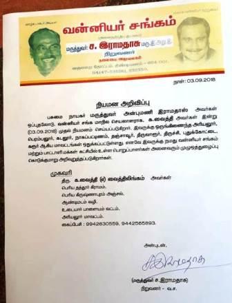 வன்னியர் சங்க நிறுவனர் ச.ராமதாஸ் விடுத்துள்ள நியமன அறிவிப்பு: